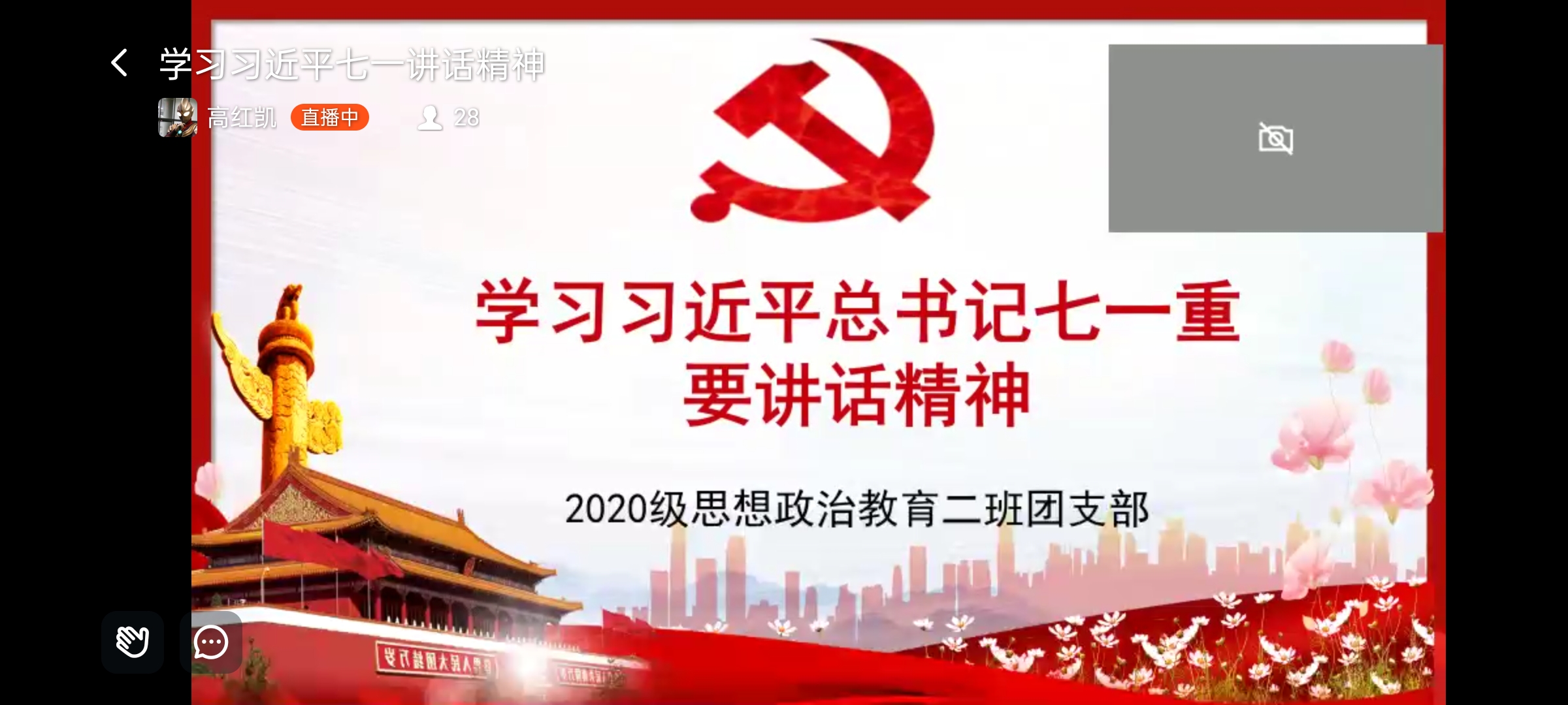 为促使我班团员深入领会习近平总书记“七一”重要讲话精神,感悟百年沧桑巨变、明确自身使命担当,8月12日下午,fun88乐体育官网体育2020级思想政治教育定向二班团支部学习习近平总书记“七一”重要讲话精神主题线上团日活动通过钉钉直播顺利开展。定向二班团支部全体团员参与本次活动。活动由班长高红凯主持。