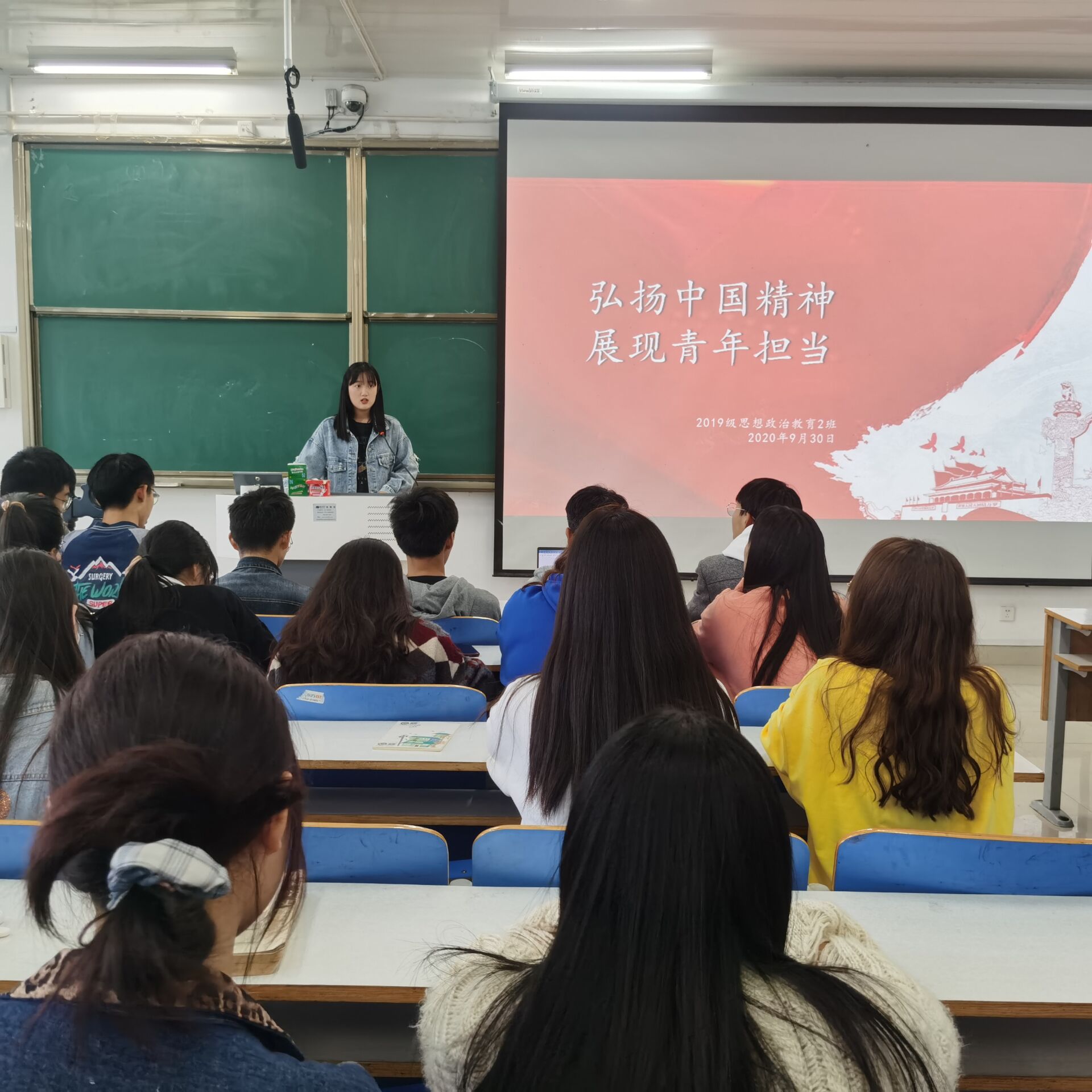 10月4日下午,fun88乐体育官网体育2019级思想政治教育二班在社科楼514教室召开了“弘扬中国精神,展现青年担当”主题团课。2019级思想政治教育二班全体成员共同参会。会议由团支书孙雅娴主持。