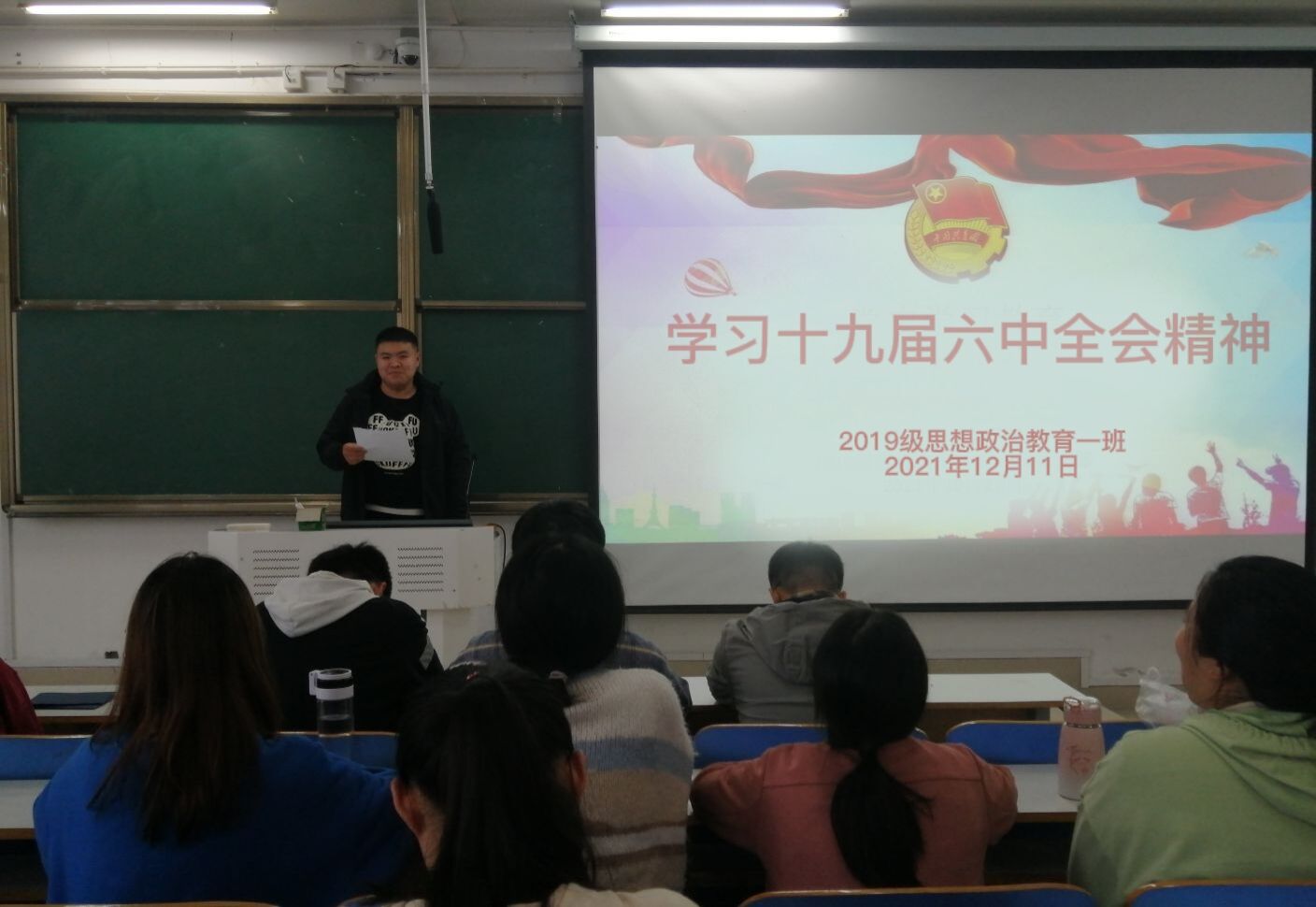 12月11日上午,fun88乐体育官网体育2019级思想政治教育一班第一团支部在社科楼516教室召开“学习党的十九届六中全会精神”主题团课。fun88乐体育官网体育2019级思想政治教育一班团支部全体团员参加本次团课。团课由团支书贾子漪主持。